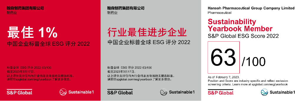 According to the assessments of the Sustainability Yearbook, these two achievements mean that Hansoh Pharma outperformed other Chinese pharmaceutical companies in terms of CSA score (63) in 2022, and made the biggest improvement in the sector. Hansoh Pharma was included in the S&P Sustainability Yearbook (Global) previously, and was the only pharmaceutical company in Chinese Mainland to be selected.